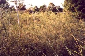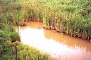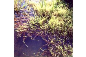 | FOTO 39 - Presença bastante freqüente de ferro na água dos mananciais. | FOTO 40 - Assoreamento do córrego e presença de ferro junto às raízes das plantas. |