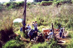 | FOTO 37 - Vegetação presente no local onde seria o leito original do corpo d’água e hoje totalmente assoreado. | FOTO 38 - Equipe da UNESP fazendo levanta mento da qualidade da água para irrigação. |