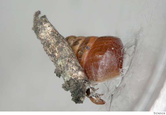 This caterpillar discovered by a former UC Berkeley biologist in Hawaii seems to have learned a thing or two from ole Mr. Spider -- namely, how to use its silk to trap prey. Photo courtesy of Science
